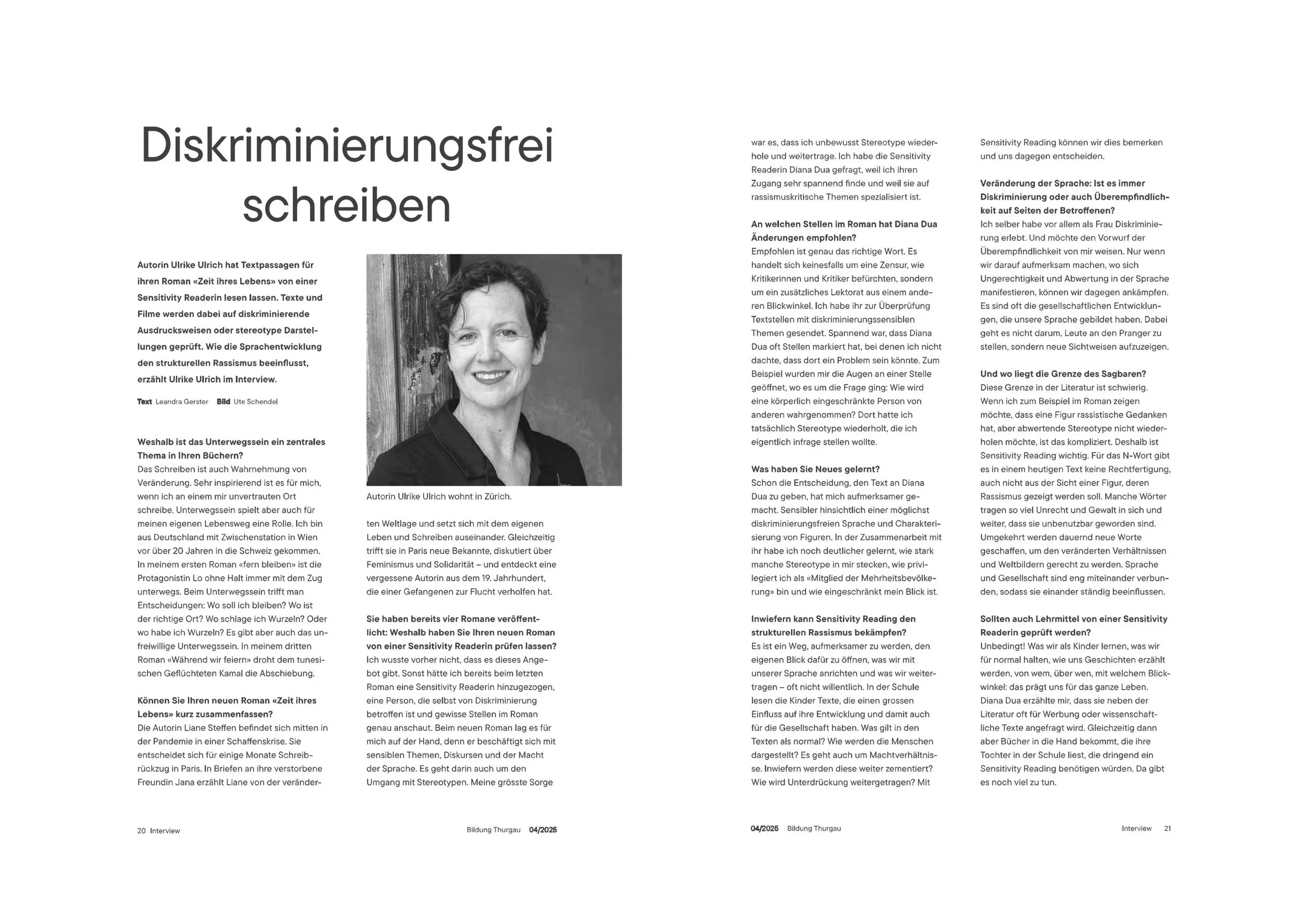 Die Zusammenarbeit mit Diana war für mich, auch über das Manuskript hinaus, sehr produktiv und erhellend. Leandra Gerster hat mich für Thurgau dazu interviewt. Das gesamte Interview findet sich auf Seite 20/21.